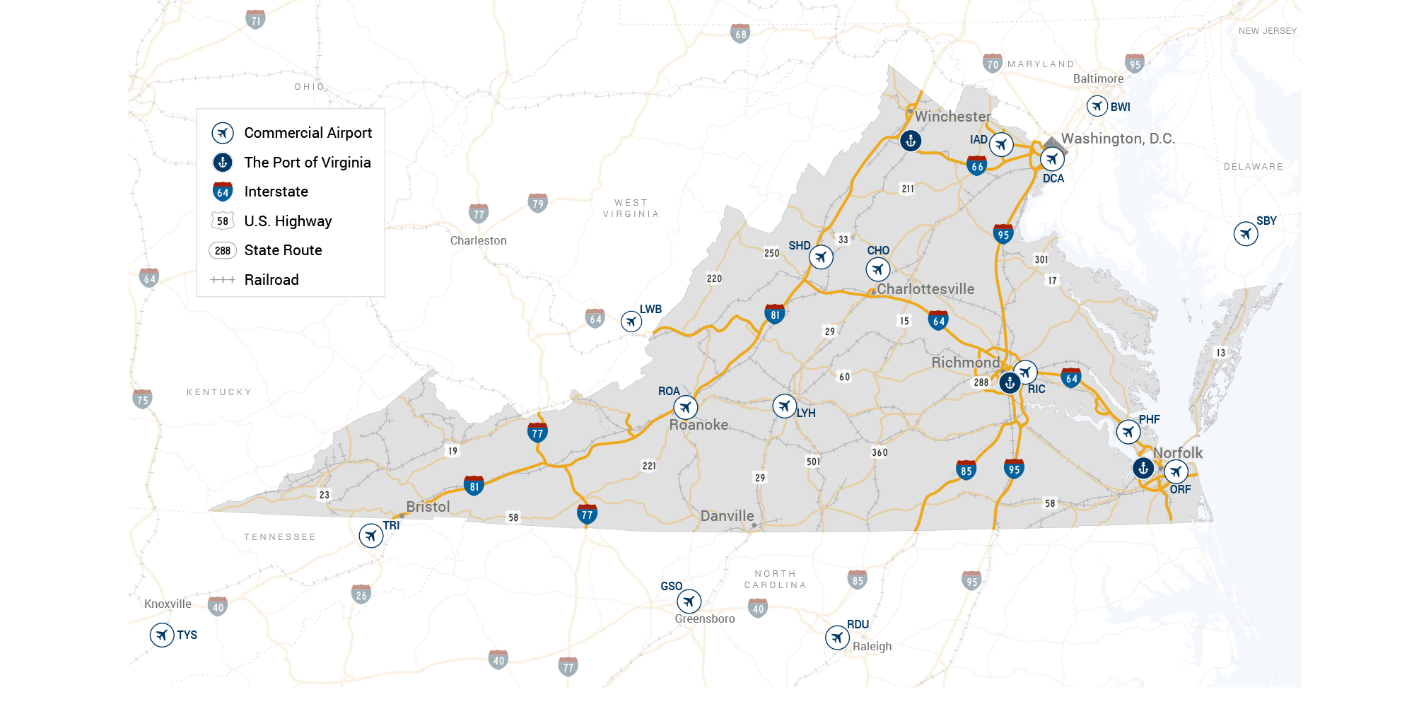 A dense network of roads, railways, ports, and airports allows for easy worldwide interconnectivity and efficient operational logistics. Virginia is covered by the second-densest roadway and railway networks in the Southeast and served by the third-largest port on the East Coast. Port facilities include four deep-water terminals in Hampton Roads, the inland Richmond Marine Terminal, and the Virginia Inland Port. In 2024, after completion of a $1.5 billion modernization and expansion project, The Port of Virginia will be the East Coast’s deepest port and one of the most advanced in the world.