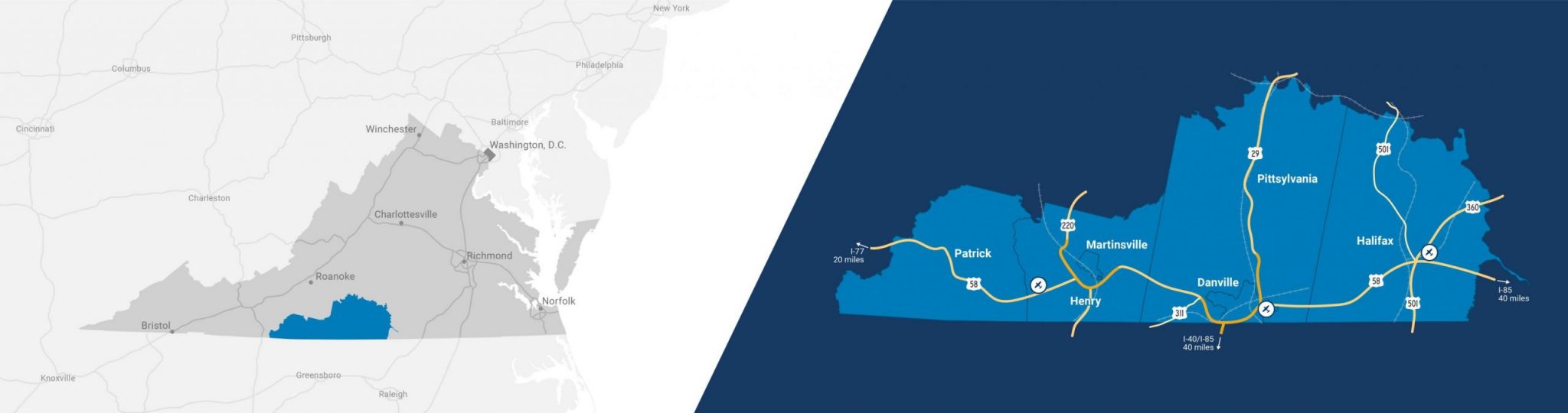 Southern Virginia is located along the Virginia/North Carolina state line at the foothills of the Blue Ridge Mountains. An excellent highway system coupled with easy access to interstates make the region extremely well-suited to reach Mid-Atlantic markets and international shipping facilities.
